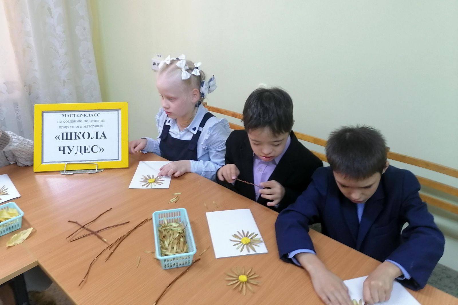 Ребятам было предложено оформить поздравительную открытку, используя разноцветные листья, ветки и плоды ясеня. Работы выполнялись в разных техниках: аппликация, аппликация на пластилине, панно. Дети серьезно отнеслись к изготовлению поделки и вложили много фантазии, терпения, труда.
