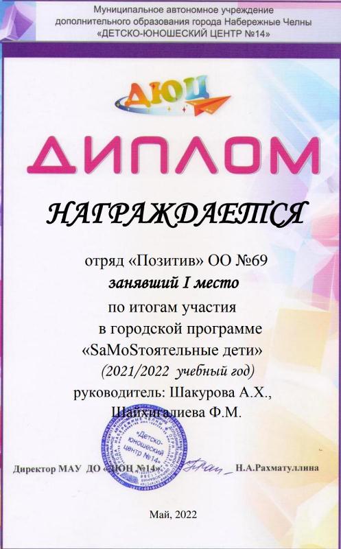 Опубликовано: 22.05.2022Отряд "Позитив" (руководители Шакурова А.Х. и Шайхигалиева Ф.М.) был награждён дипломом за 1 место по итогам участия в городской программе "SaMoSтоятельные Дети" за 2021/2022 уч.г.