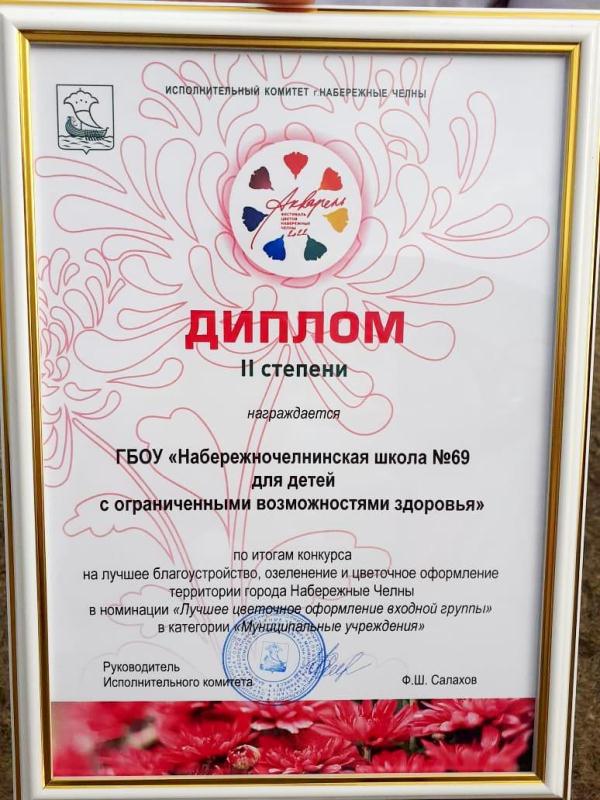 Опубликовано: 31.08.2022По итогам конкурса на лучшее благоустройство, озеленение и цветочное оформление территории города Набережные Челны в номинации «Лучшее цветочное оформление входной группы» в категории «Муниципальные учреждения» наша школа ГБОУ «Набережночелнинская школа №69» стала обладателем диплома II степени.