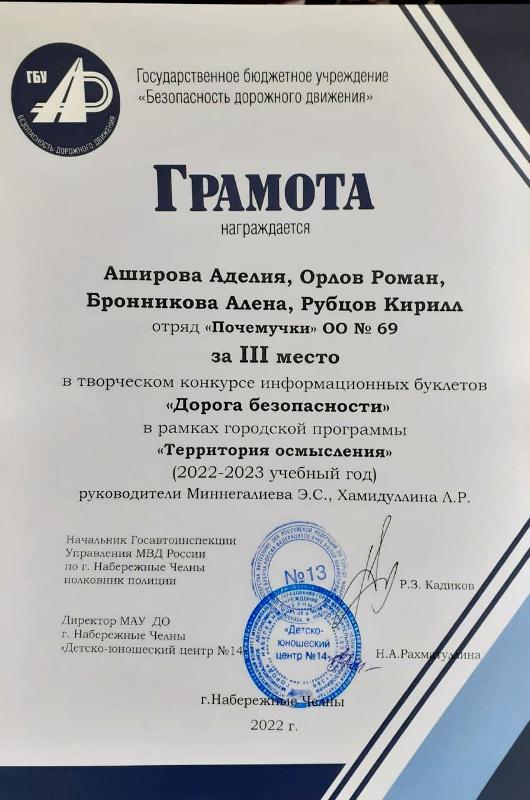 Опубликовано: 01.11.20221 ноября 2022г ученики 6а и 6б классов под руководством классных руководителей Хамидуллиной Л.Р. и Миннегалиевой Э.С. посетили мероприятие в ДЮЦ №14, посвященное награждению участников конкурса информационных буклетов «Дорога безопасности».