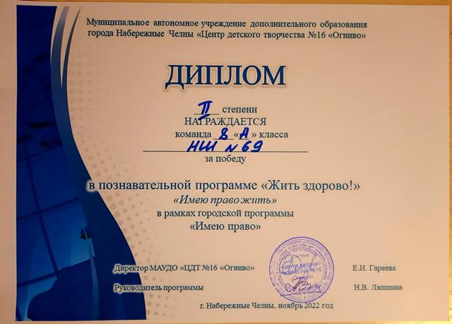 Опубликовано: 08.11.202208.11.2022 г. обучающиеся 8а класса под руководством педагога Акбировой Г.Т. приняли участие в квизе «Жить здорово!» в рамках городской программы «Имею право». Команда успешно справилась со всеми заданиями и по итогам мероприятия награждена дипломом за II место.