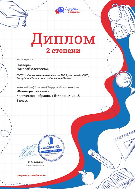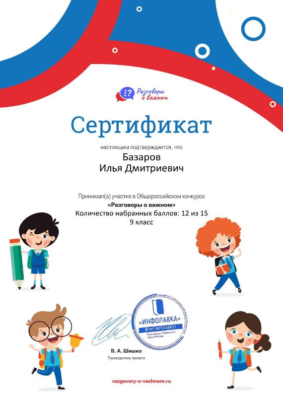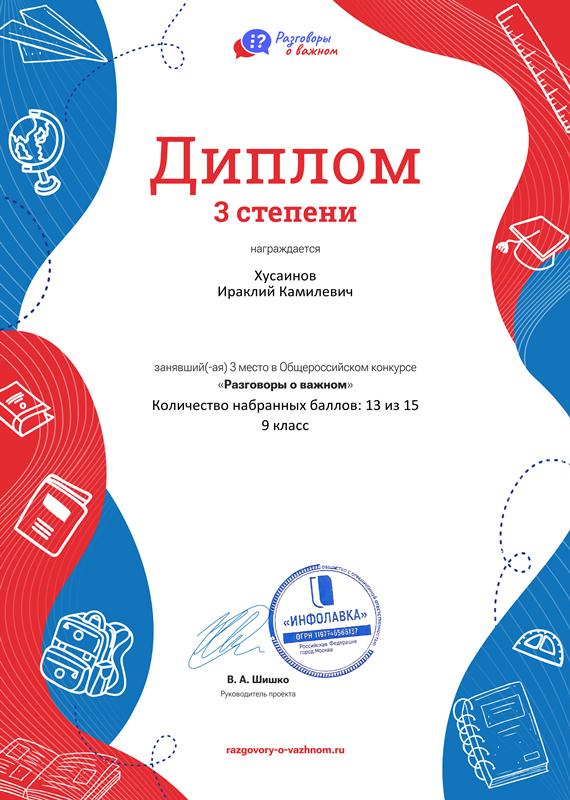 Ученики 9-х классов нашей школы закрепили свои знания, участвуя в Общероссийском конкурсе. Награждены сертификатами и дипломами 2 и 3 степени, Хусаинов Ираклий, Чередниченко Валерий, Пивторак Николай. сертификаты Гатин Ислам, Базаров Илья, Асоева Сабина, Мусатов Тимур.