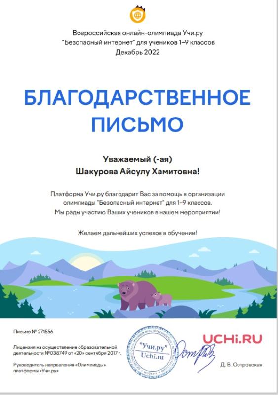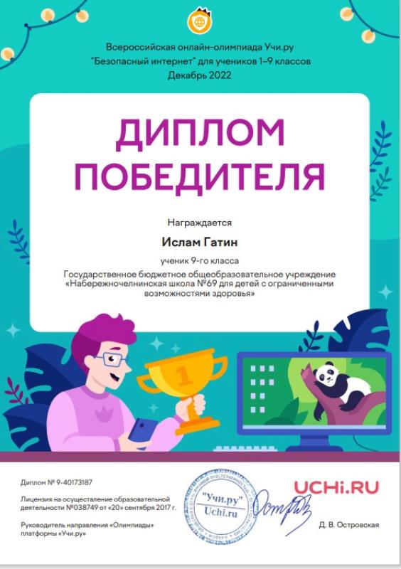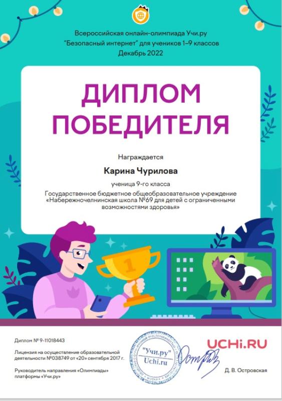 Опубликовано: 27.12.202227 декабря завершилась Всероссийская онлайн-олимпиада «Безопасный интернет» на образовательной платформе Учи.ру для учеников 1–9 классов. Учащиеся 9Б класса (кл.руководитель Шакурова А.Х.) получили дипломы 1 степени.