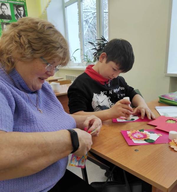 Ученики 5а и 5б классов под руководством Шакуровой А.Х., Софроновой Е.В. выполнили своими руками поздравительную открытку-сувенир «Для мамы – с любовью» и цветочную композицию «Любимой маме».
