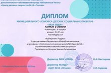 Учащийся 7Б класса Набиуллин Р. под руководством Кокуевой Э.Э. награждён Дипломом 1 степени за участие в муниципальном конкурсе детских социальных проектов, направленных на военно-патриотической воспитание подрастающего поколения "Я-патриот России".