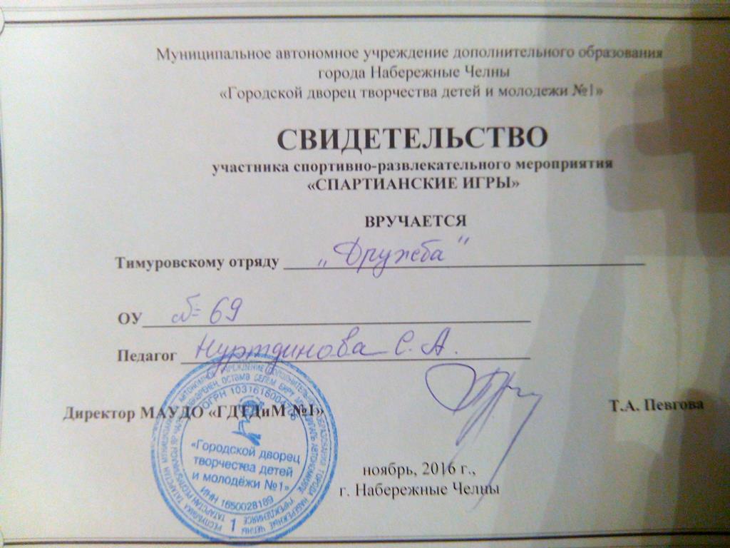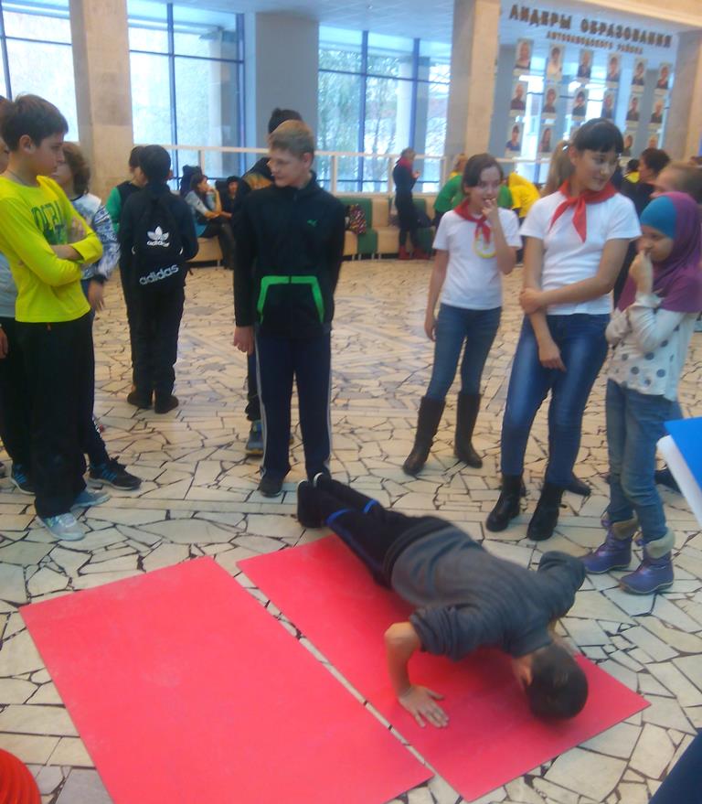 Опубликовано: 01.11.20161 ноября в ГЦДТ №1 была проведена для тимуровцев Эстафета Спартианские игры. Программа игр состояла из следующих этапов: разминка, представление команд, эстафета на меткость, прыжки через скакалку, логический конкурс, отжимание, конкурс с картинками, прыжковая эстафета, и наконец танцы. В ходе игр ребята продемонстрировали спортивные навыки, умение работать в команде и волю к победе.