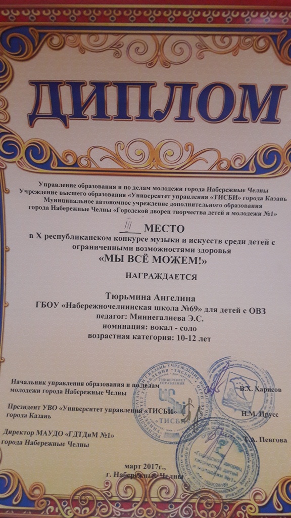 23.03.2017 в ГДТДиМ№1 прошел Гала-концерт Х республиканского конкурса музыки и искусства среди детей с ограниченными возможностями здоровья «Мы все можем!». Учащиеся 5-6 классов Тюрьмина Ангелина и Калимуллин Владимир были награждены дипломами III степени в номинации вокал-соло. Руководитель Миннегалиева Э.С.
