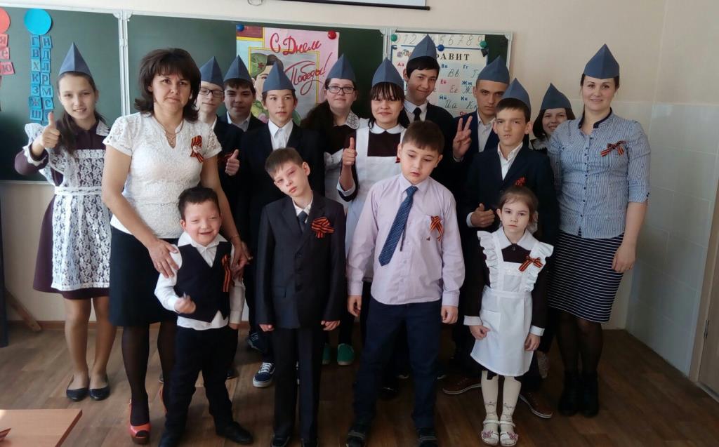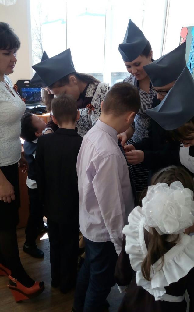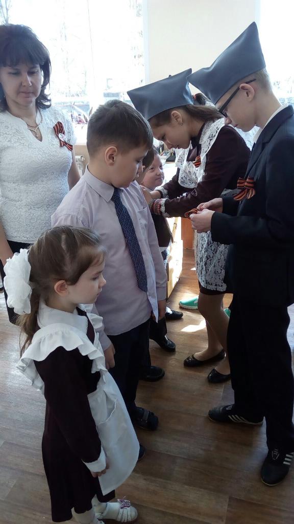 Подарок от тимуровского отряда. Тимуровский отряд "ДРУЖБА" познакомил первоклассников с Георгиевской ленточкой. Ребята рассказали как их нужно правильно носить у сердца, сложенную петлей, и прикрепили им ленту.