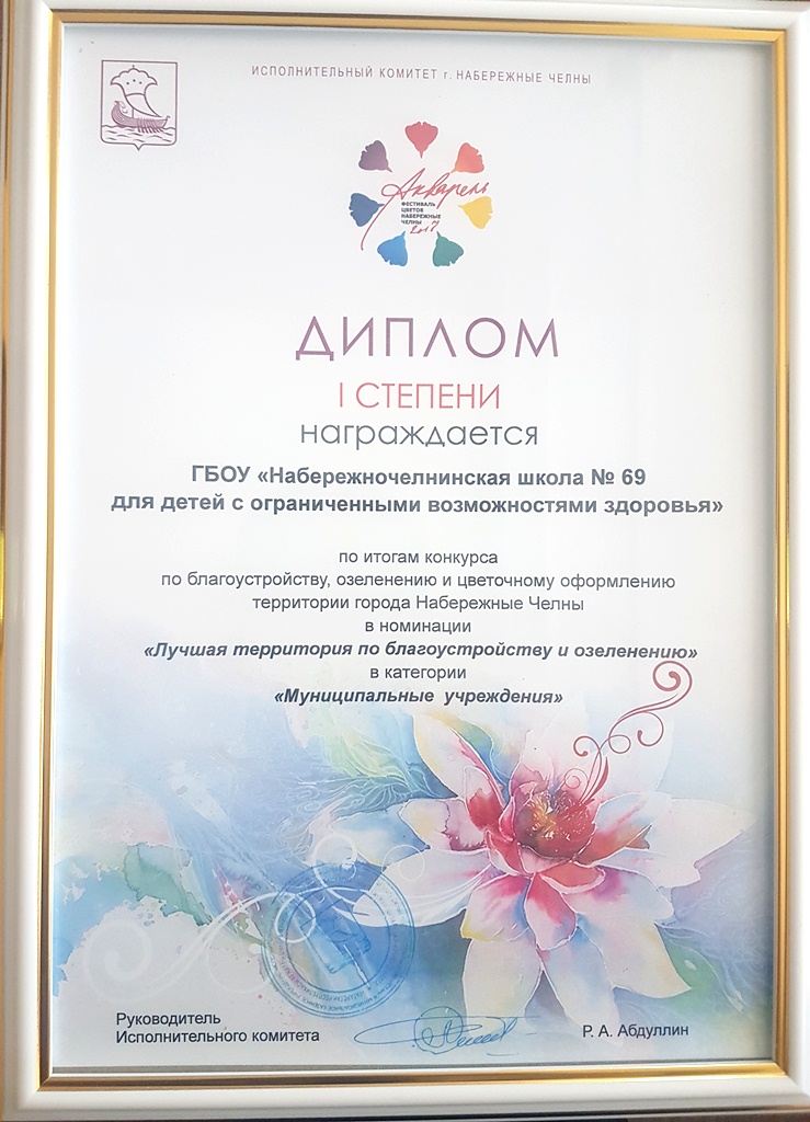 Опубликовано: 30.08.201730 августа 2017 года состоялось торжественное вручение диплома 1 степени коллективу школы по итогам конкурса по благоустройству, озеленению и цветочному оформлению территории города Набережные Челны в номинации "Лучшая территория по благоустройству и озеленению" в категории "Муниципальные учреждения".