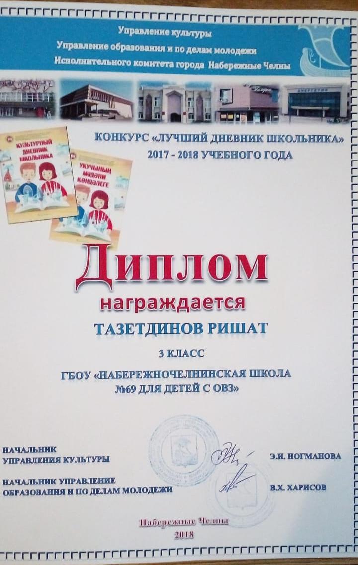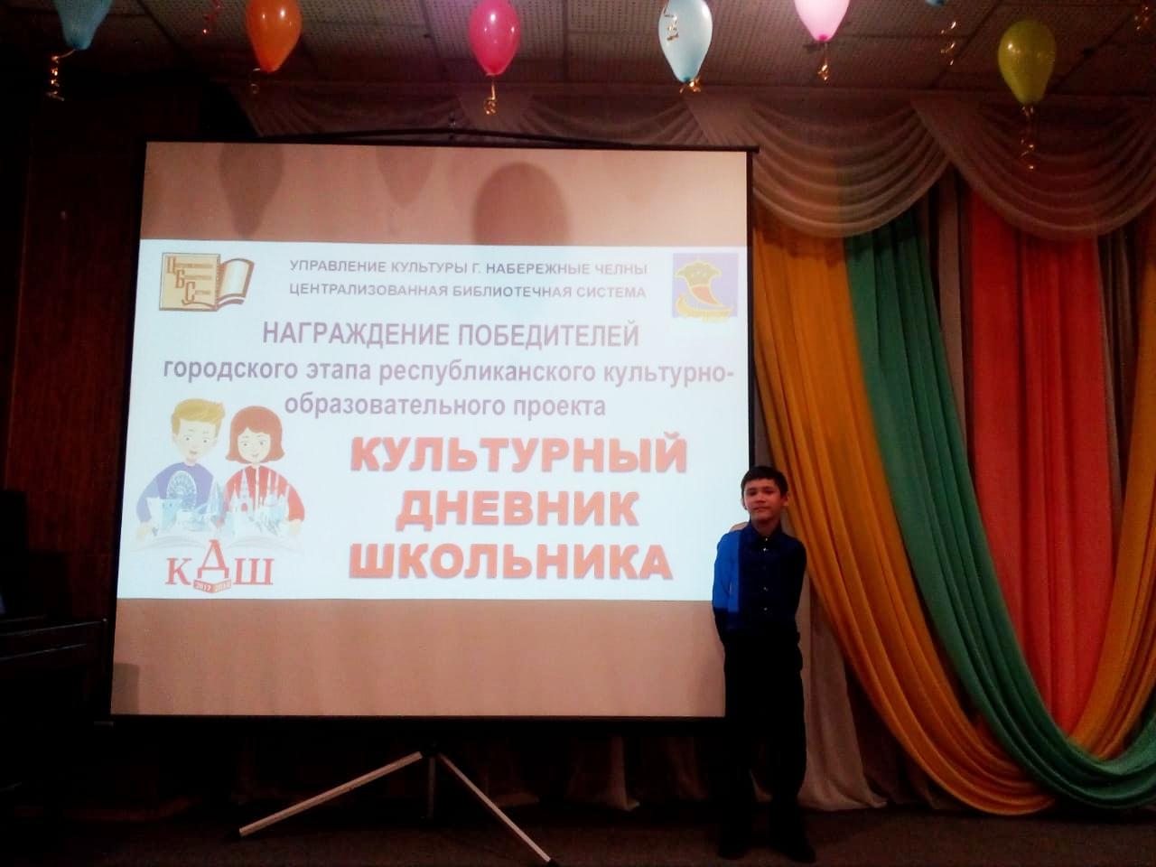 15 мая 2018 года в Центральной городской библиотеке состоялось подведение итогов Республиканского культурно-образовательного проекта «Культурный дневник школьника». Одним из победителей стал ученик 3а класса Тазетдинов Ришат. Победитель получил диплом.