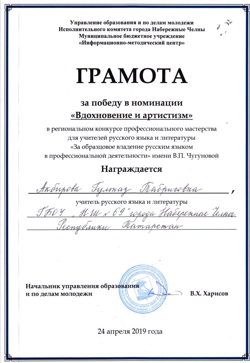 24.04.2019г. завершился IX региональный конкурс среди учителей русского языка и литературы «За образцовое владение русским языком в профессиональной деятельности» имени Чугуновой В.П. ГБОУ «Набережночелнинская школа №69» представляла Акбирова Г.Т., учитель русского языка и литературы. Набрав максимальное количество баллов на 1 отборочном этапе конкурса за эссе на тему «Учитель: учит или воспитывает?», Гульназ Табрисовна прошла во 2 (очный) тур, на котором надо было подготовить выразительное чтение наизусть на русском языке отрывка из любого драматургического произведения (пьесы), в связи с тем, что 2019 год объявлен Годом Театра в России. По итогам второго этапа конкурса педагог награждён грамотой за победу в номинации «Вдохновение и артистизм».