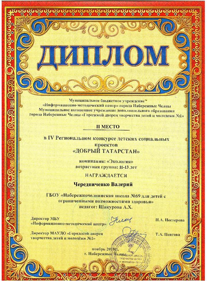 Опубликовано: 02.12.2019Тимуровский отряд школы в лице ученика 6Б класса Чередниченко Валерия под руководством педагога Шакуровой А.Х. занял 2 место в IV Региональном конкурсе детских социальных проектов "Добрый Татарстан" в номинации "Экология" ("Берегите родники").