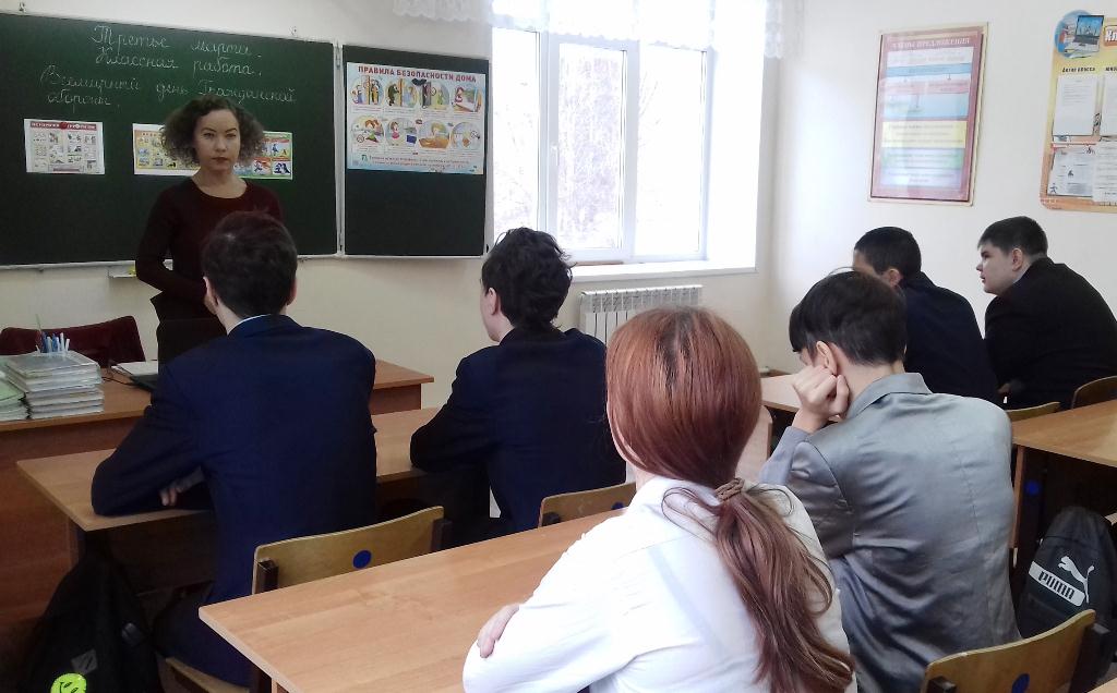 Согласно воспитательному плану мероприятий 03.03.2020г. в 9б классе педагогом Акбировой Г.Т. был проведён единый классный час «Всемирный день Гражданской обороны». Цели и задачи данного мероприятия: создать условия для знакомства учащихся с историей возникновения Гражданской обороны в мире и России, а также функциями, системой мер Гражданской обороны, с руководителями ГО, задачами, сигналами ГО и действиями населения в военное и мирное время; формировать ответственное отношение к собственной жизни и безопасности. Ребята посмотрели тематическую презентацию, ознакомились с памятками по ОБЖ и ГО, приняли активное участие в беседе.
