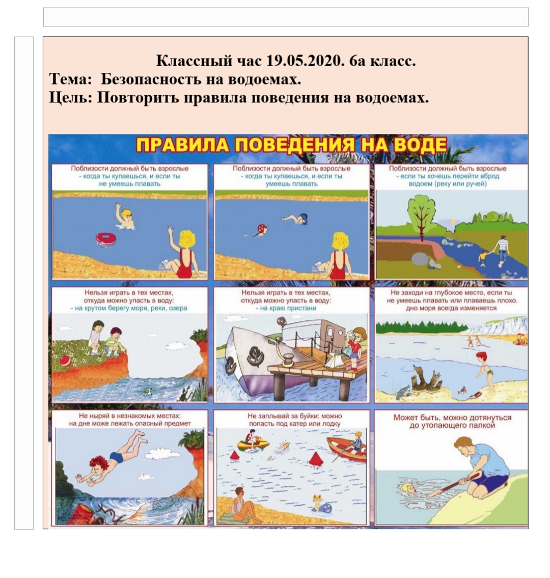 Опубликовано: 21.05.202019.05.2020 года в 6 а классе в преддверии летних каникул был проведен классный час на тему "Безопасность на водоёмах". Ребята просмотрели фильм и ответили на вопросы.
