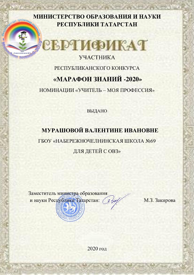 Опубликовано: 01.02.2021Педагоги школы Валиева Р.Р., Мурашова В.И., Хамидуллина Л.Р., Гатин Р.Ш., Гаевой А.Г., Широв С.Г., Шайхигалиева Ф.М. приняли активное участие в Республиканском конкурсе «Марафон знаний» в номинации «Учитель – моя профессия» (дистанционно) и получили сертификат участника.