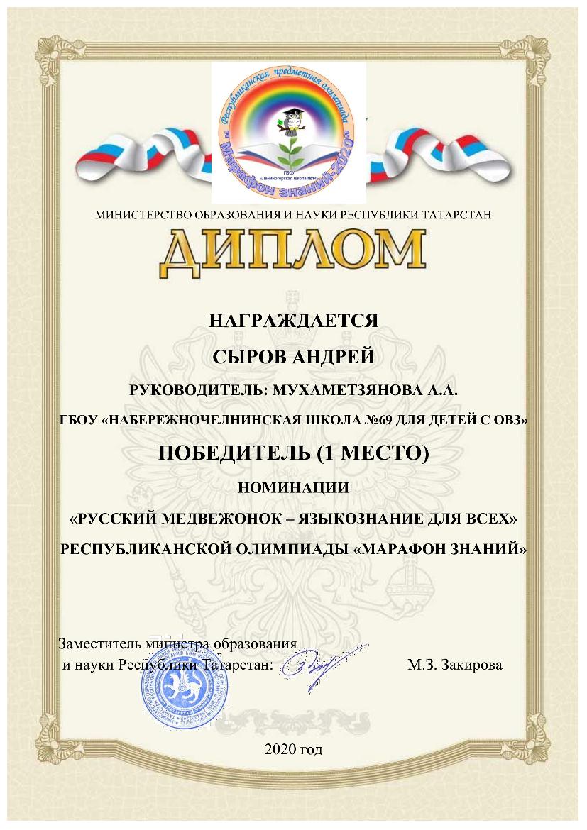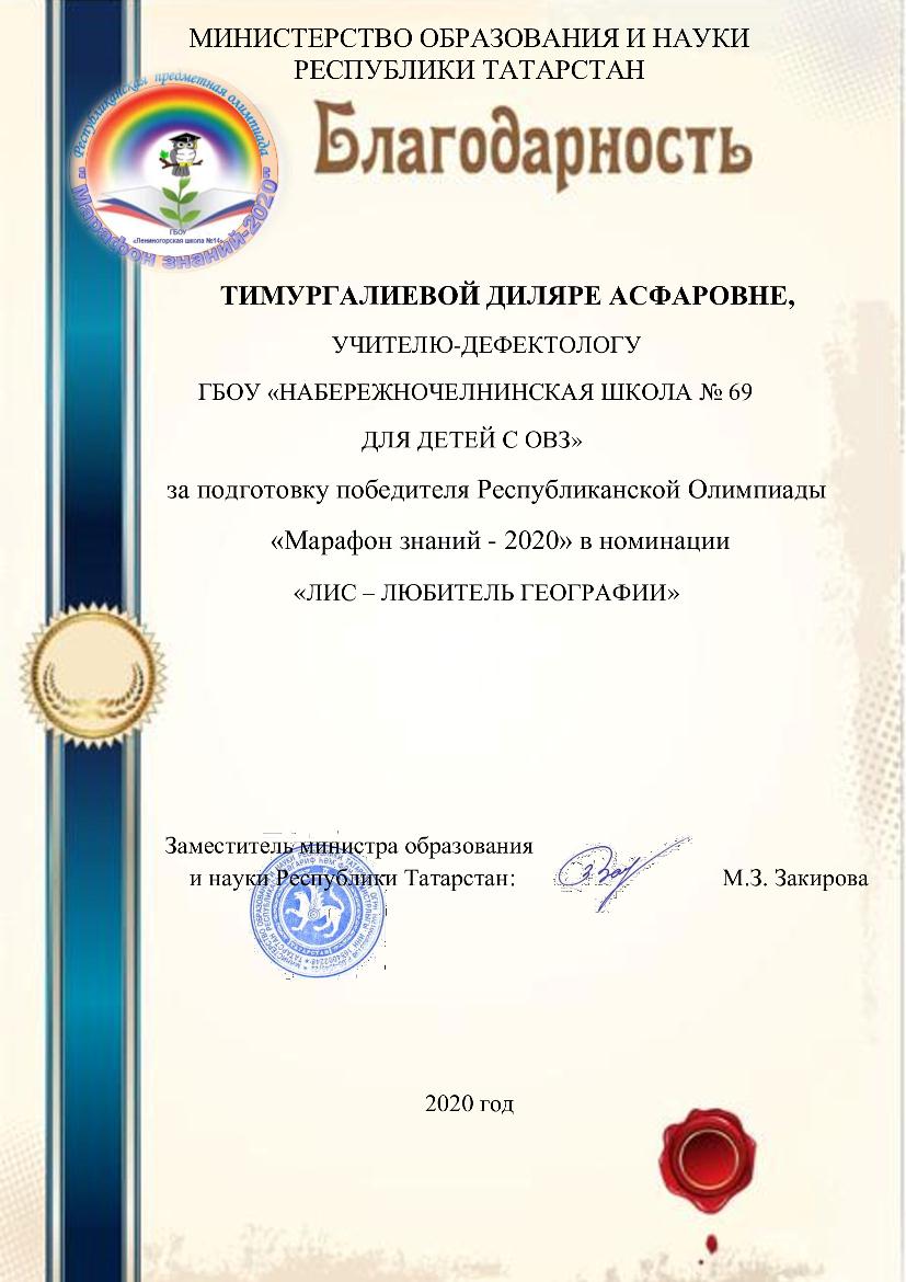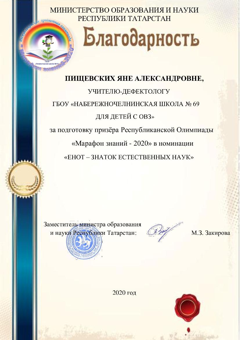 Также обучающиеся нашей школы приняли участие в республиканской предметной олимпиаде «Марафон знаний – 2020» (дистанционно) для обучающихся, воспитанников с ограниченными возможностями здоровья по общеобразовательным предметам и были награждены дипломами победителей, призёров и сертификатами участников. Педагоги, подготовившие обучающихся, получили благодарность.