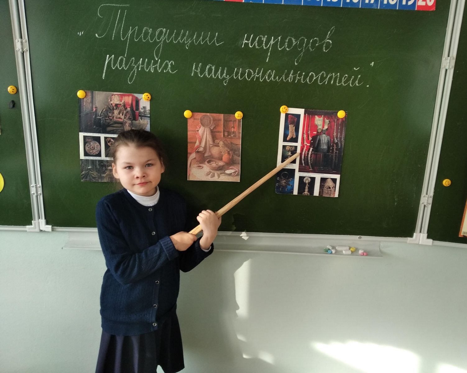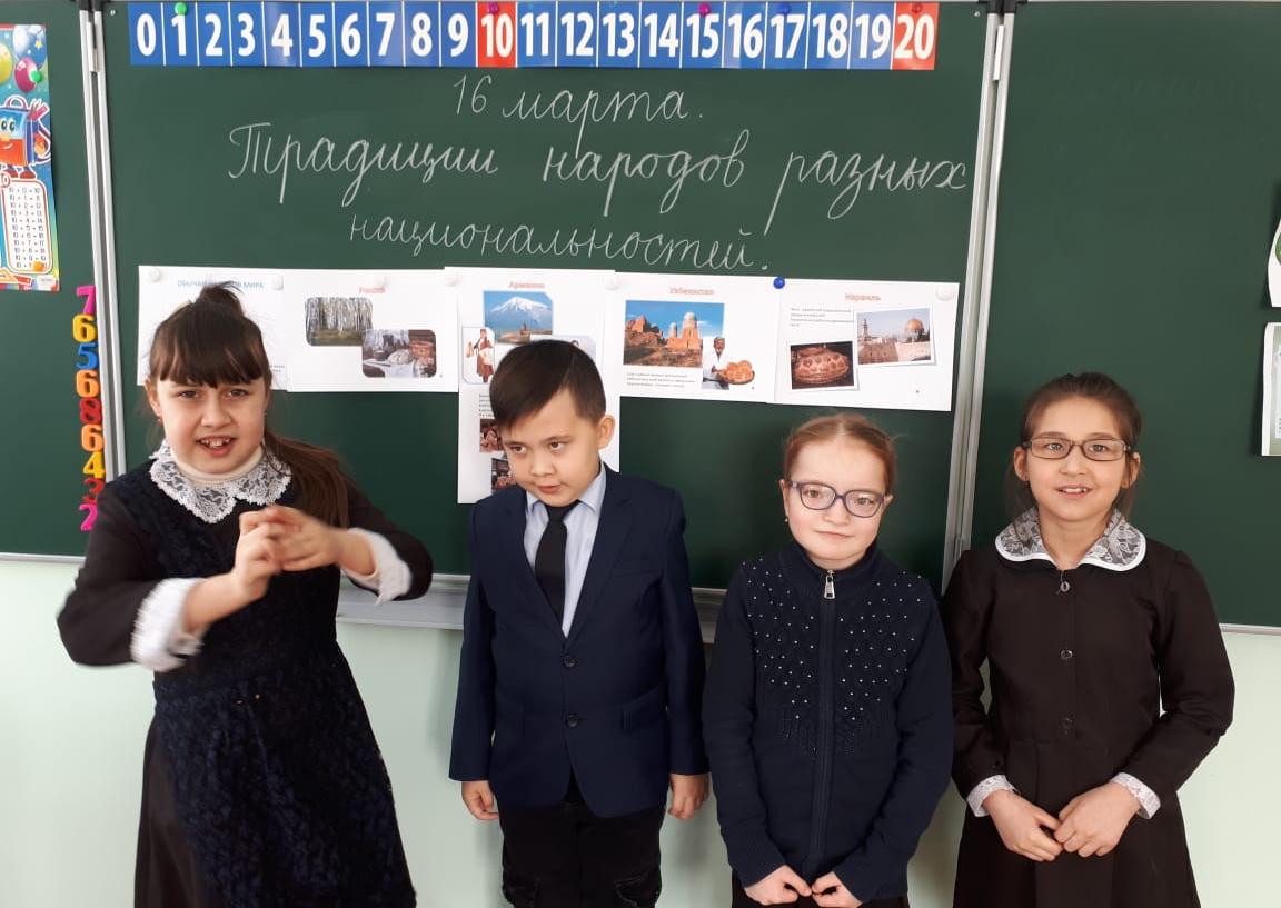 Татарстан Республикасында Туган телләр һәм халыклар бердәмлеге елы планы нигезендә 16нчы март көнне 2-4нче сыйныф укучылары өчен “Куптөрле милләт халыкларының традицияләре” дигән темага сыйныф сәгате үткәрелде. Укучылар төрле милләт вәкилләренең традицияләре, гореф – гадәтләре, милли киемнәре, халык ашлары белән таныштылар. Татар һәм рус милләтләренең мәдәни традицияләре хакында әңгәмә үткәрелде, презентация каралды. Укучылар күптөрле һәм файдалы мәгълүмат тупладылар.