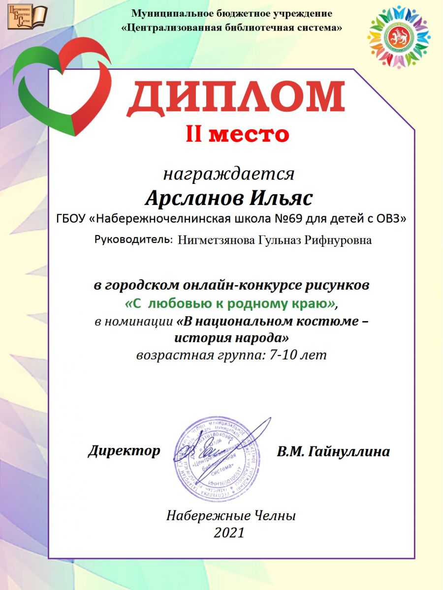 3нче б сыйныфы укучысы Арсланов Ильяс Яр Чаллы шәһәренең Үзәк китапханәсе оештырган “Туган төбәгемә мәхәббәт белән ” дип исемләнгән онлайн рәсем конкурсының “Милли киемнәрдә – халкым тарихы ” номинациясендә катнашты. Конкурсның төп максаты : үсеп килүче буыннарда патриотизм хисе һәм Туган илгә мәхәббәт тәрбияләү. Бурычлары булып Татарстан халыкларының гореф – гадәтләре һәм мәдәнияте белән таныштыру, балалар һәм яшьүсмерләрнең иҗади сәләтләрен үстерү алынды. Ильяс 2 нче дәрәҗә Диплом белән бүләкләнде.