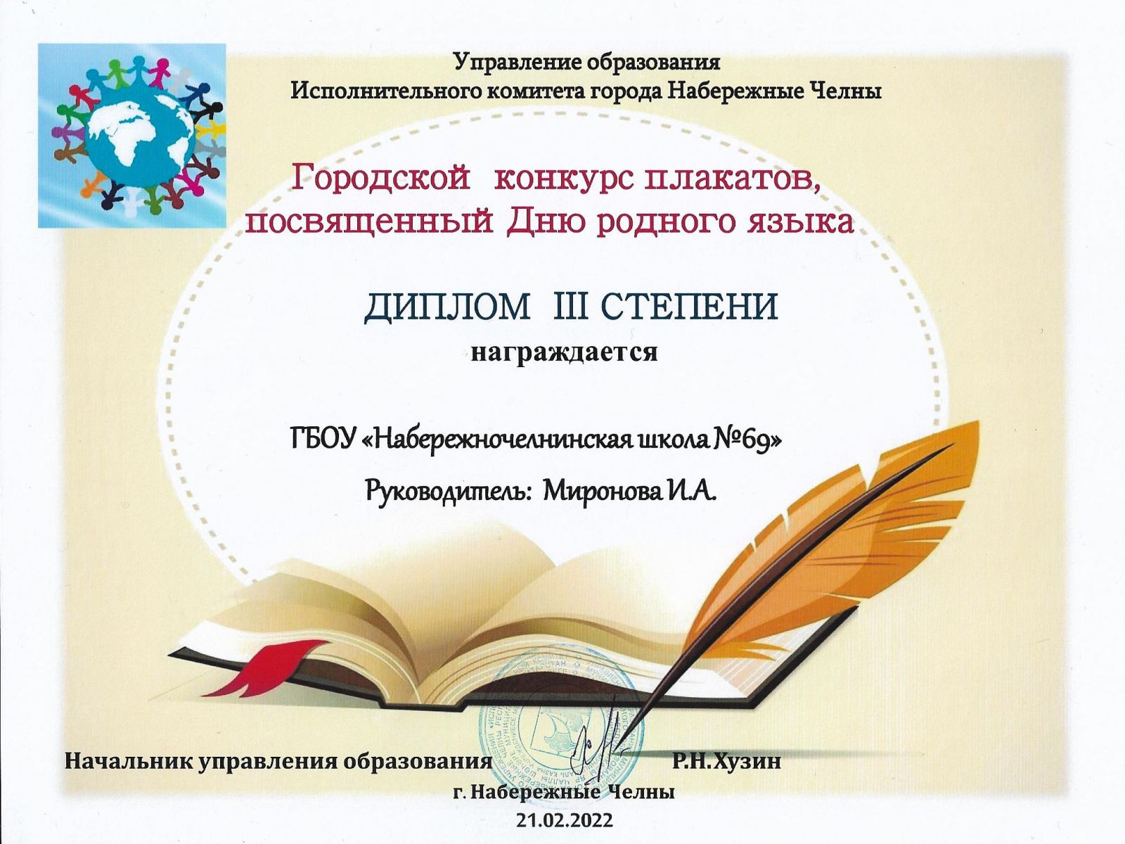 2022 нче елның 1 нче һәм 14 нче февраль аралыгында 3 нче б сыйныфы укучылары белән Миронова Ирина Александр кызы җитәкчелегендә Халыкара туган тел көненә багышланган плакатлар бәйгесе уздырылды. Бәйгедә 42 эш арасыннан 3 нче урынга лаек булдылар. Туган телгә сак һәм хөрмәт белән карау – бәйгедә төп максатларның берсе иде.