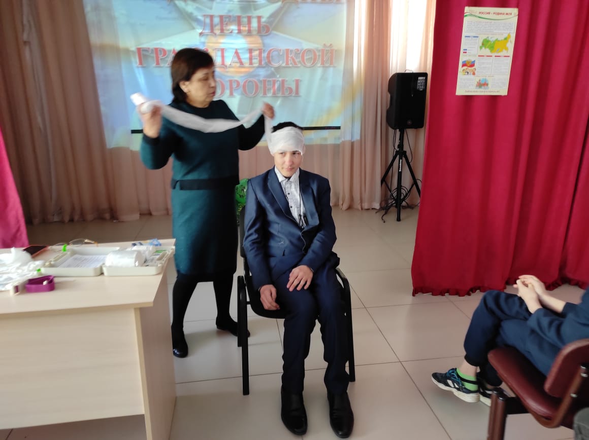 Ученики узнали историю возникновения ГО, выполняли практические задания друг на друге, повторили инструкцию поведения в чрезвычайных ситуациях. В конце была проведена викторина на тему "Гражданская оборона".