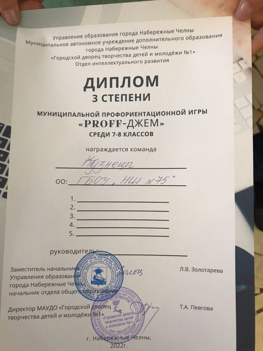 В МАУДО "ГДТДиМ №1" также прошла профориентационная игра "PROFF-ДЖЕМ". И наша команда 8 А класса (Кл. рук.Зарипова Р.Т.) с успехом приняла участие.
