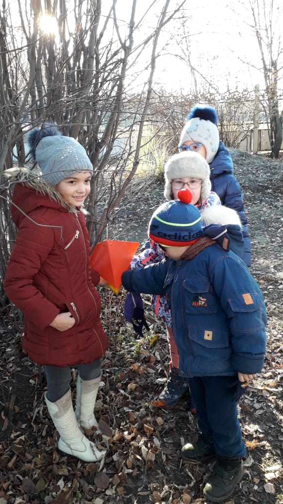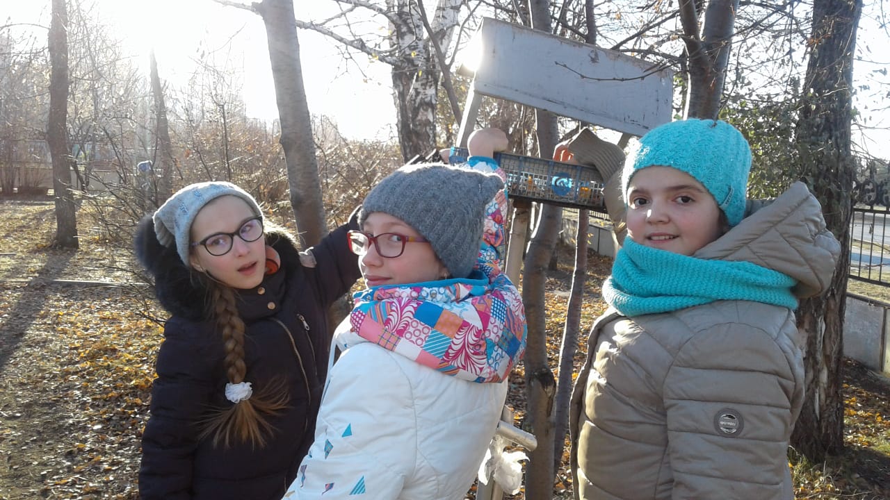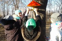 Ученики школы развесили кормушки на деревья и регулярно насыпают в них корм: крошки белого хлеба, нежареные семечки подсолнуха, пшено и др.