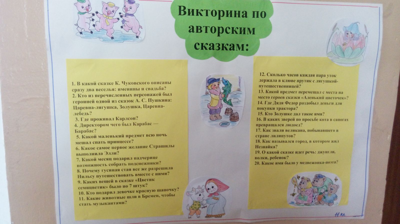 Целую неделю в нашей школе проходила викторина под названием «В мире сказок». Ребята легко справились со всеми заданиями и на переменах говорили отгадки учителям. Молодцы!