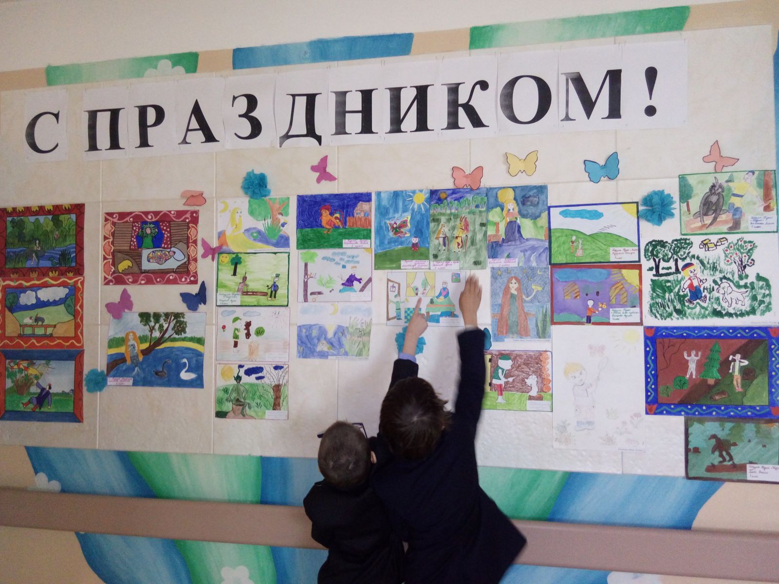 В школе прошла выставка рисунков ко дню ПОБЕДЫ. Теперь все работы украшают холл первого этажа.