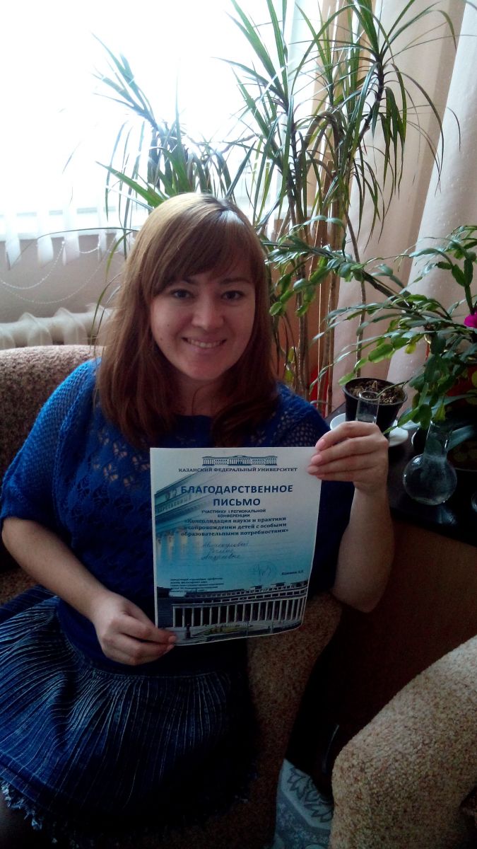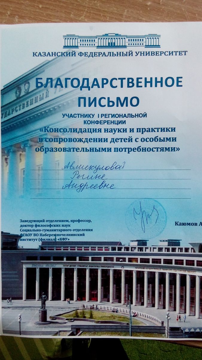 Психолог школы Авлиекулова Регина Андреевна приняла участие в первой Региональной Конференции "Консолидация науки и практики в сопровождении детей с особыми образовательными потребностями" и получила благодарственное письмо. Желаем дальнейших успехов!