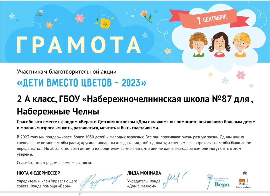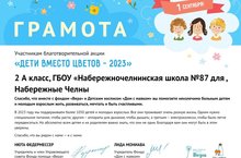 Ученики 2а класса дружно приняли участие во Всероссийской акции "Дети- вместо цветов", за свои добрые и неравнодушные сердца они получили благодарственную грамоту.