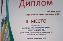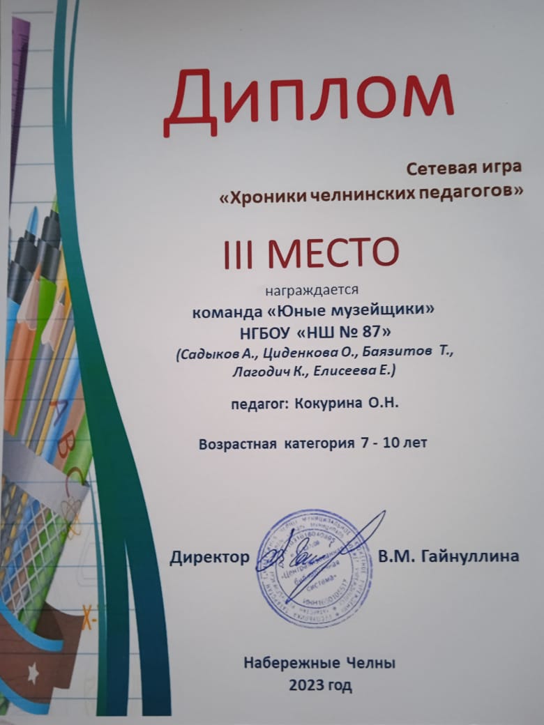 С декабря 2022 года по 22 февраля 2023 г. В городе проходила сетевая этапная игра по программе "Музейный Вернисаж" ПИАР-ПРОЕКТ- 2023 г., в котором принял участие 1б класс и занял почетное 3 место. Команда "Юные Музейщики " награждена Дипломом и дидактической игрой. Молодцы. Так держать. Вперед к новым Победам.