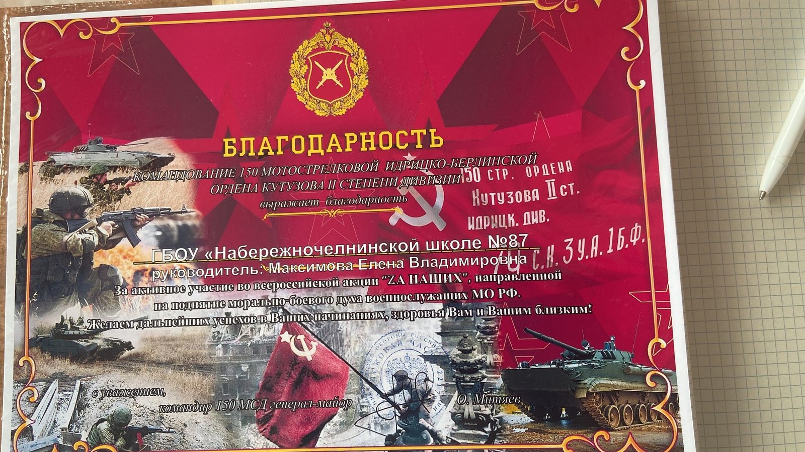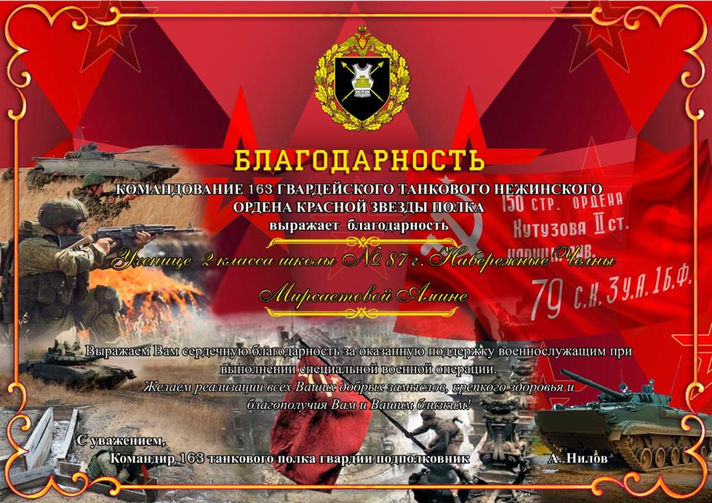 В феврале ребята участвовали в акции "Письмо солдату". На общешкольной линейке были вручены благодарственные письма от 163 гвардейского танкового нежинского ордена Красной звезды полка.