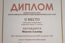 С марта по май в городе проходил муниципальный этап Республиканского конкурса по программе "Музейный вернисаж" - "Музеи- 2022", в котором принял участие ученик 4а класса Михеев Альмир ,он занял почетное 2 место, среди школьных музеев города. Сейчас его работа отправлена на Республиканский этап. Поздравляем Альмира с очередной Победой и ждем результаты Республиканского этапа.