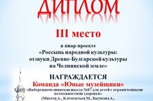 В рамках реализации городской программы "Музейный вернисаж", популяризации музейного дела, развития интереса к традициям и истокам родного края, в ноябре в городе стартовал ежегодный Пиар-Проект-2022 посвященный Волжской Булгарии. В этом проекте приняла команда "Юных музейщиков" 4 класса нашей школы и заняла почетное 3 место, среди образовательных учреждений города. Молодцы. Поздравляем и Гордимся, вперед к новым Победам!
