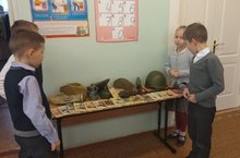 В 1-а классе открылась выставка "На пути к Победе" на выставке были предоставлены экспонаты: ремни,пилотки,фляжка,каска,противогаз и книги на военную тематику. Детям рассказали о суровых днях в военные годы.