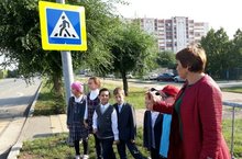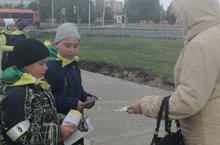 Отряд ЮИД 4 класса во время рейда на проспекте Дружбы Народов раздает листовки пешеходам