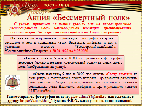Более семи десятилетий отделяют нас от кровопролитнейшей войны ХХ столетия. Великая Отечественная война не просто вписана в историю страны, но и является отдельной главой в летописи каждой семьи. Это след в судьбе каждой семьи, который не сотрётся временем. С памятного мая 1945 года выросли новые поколения. Для них Великая Отечественная война – далёкая история. Но совесть и долг перед погибшими и пережившими войну не должны позволить нам забыть эту героически-трагическую страницу в истории нашего государства. Поэтому приглашаем всех, кому не безразлична история своего рода, принять участие в акции «Бессмертный полк».