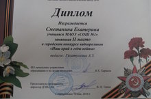 Городской конкурс видеороликов 06.05.2016 Ученица 7а класса приняла участие в городском конкурсе видеороликов «Наш край в годы войны» и заняла почетное 2 место. Руководитель: Гизатуллина А.Р.
