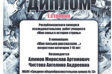 Дипломом первой степени в республиканском конкурсе "Моя семья в истории страны" награждены ученики 3Б класса Алимов Мирослав и Чистова Ангелина. Они ученики Лотфуллиной З.З.Поздравляем наших победителей, нам приятно радоваться за коллег! 17.04.2019
