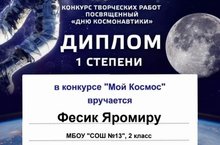 Мы поздравляем Фесик Яромира, ученика 2 "Б" класса c Дипломом I степени в конкурсе "Мой Космос". -