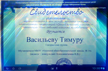 Муниципальное автономное образовательное учреждение дополнительного образования детей "Центр детского творчества № 16 "Огниво" города Набережные Челны наградил свидетельством об участии ученика 7 "Б" класса Васильева Тимура, который был вручен за участие в номинации "Наш любимый классный руководитель".