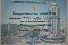 Управление образования Исполнительного комитета города Набережные Челны Муниципальное автономное образовательное учреждение дополнительного образования детей "Детский эколого- биологический центр № 4" наградил свидетельством об участии команду "Улыбка природы" школы № 14 участников 2 этапа "Мой город - Челны" городской эколого- краеведческой игры "Зеленая эстафета".
