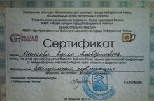 Начальник управления культуры города Набережные Челны Кулакова Р.К. наградила Минаеву Аделю ученицу 8 "А" класса, Несмелову Аделю ученицу 7 "Б" класса и Иванову Анну ученицу 7 "Б" класса сертификатами об участии во Всероссийской научно- практической конференции "Родной край: история и современность".