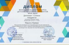 Ученица 8 "б" класса Марьина Варвара , под руководством педагога-организатора Ершовой Н.В. приняла участие в конкурсе детских социальных проектов "Моя идея" и стала дипломантом 1 степени в номинации "Добрый город".