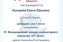 Поздравляем победителя IV Международного конкурса компьютерного творчества ученицу 2 Г класса Козыреву Елену (научный руководитель Капалыгина Р.Г.) Молодцы! Так держать!