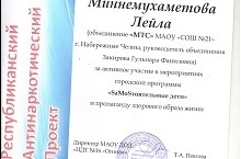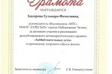 Поздравляем объединение "МТС" Сош № 21 (научный руководитель Закирова Г.Ф.), за пропаганду здорового образа жизни и активное участие в реализации республиканского антинаркотического проекта "SaMoSтоятельные дети" 05.05.2014