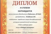 Поздравляем воспитанников объединения "Родничок" (научный руководитель Утябаева Е.М.), ПОБЕДИТЕЛЕЙ городского этапа Республиканской историко - краеведческой экспедиции "Тайны Родного края" 08.05.2014