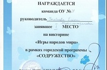 Поздравляем команду МАОУ "СОШ № 21", (научный руководитель Утябаева Е.М.) занявших 1 место в муниципальной викторине "Игры народов мира", в рамках городской программы "СОДРУЖЕСТВО" 7В 15.05.2014