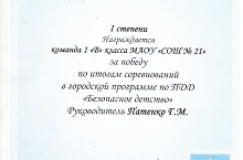 Поздравляем команду 1В класса (научный руководитель Патенко Г.М.), занявших I место по итогам соревнований в городской программе по ПДД "Безопасное детство" 23.05.2014
