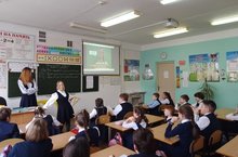 Учащиеся 8 «А» класса психолого-педагогической направленности Виктория Побегайло и Азалия Хайдарова провели урок по окружающему миру на тему « Наша планета Земля» для учащихся 4 «Б» класса